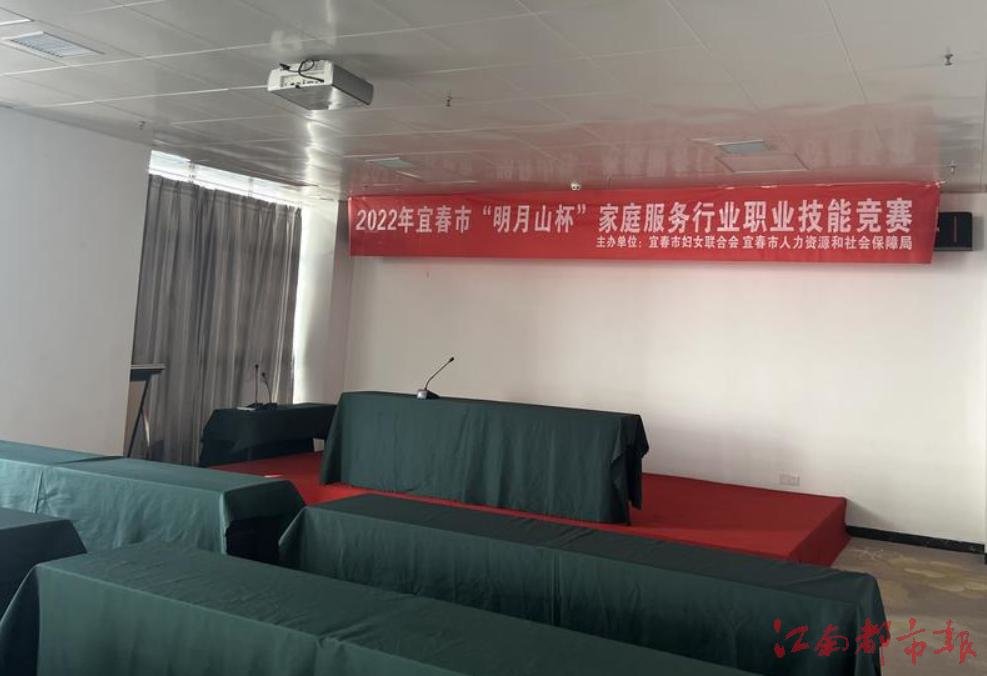 日前,记者来到该酒店,乘坐电梯到达楼顶28楼,看到楼顶被分成了4个房间,分别用作大小会议室、办公场所、商铺。会议室内悬挂的一条横幅显示,宜春市妇联、人社局在此处举办了2022年家庭服务行业职业技能竞赛。