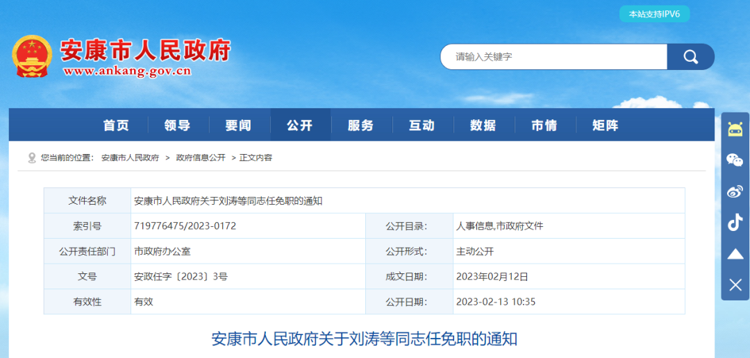 近日,安康市人民政府在其官网发布一批人事任免通知。
