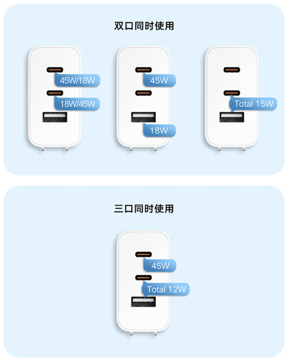 IT之家从商品页面了解到,该充电器 Type-C 1/2 单口输出最大功率 67W,USB-A 单口输出最大功率 22.5W,三口可同时输出,还能智能识别电脑充电,多设备使用时优先给电脑提供稳定供电。