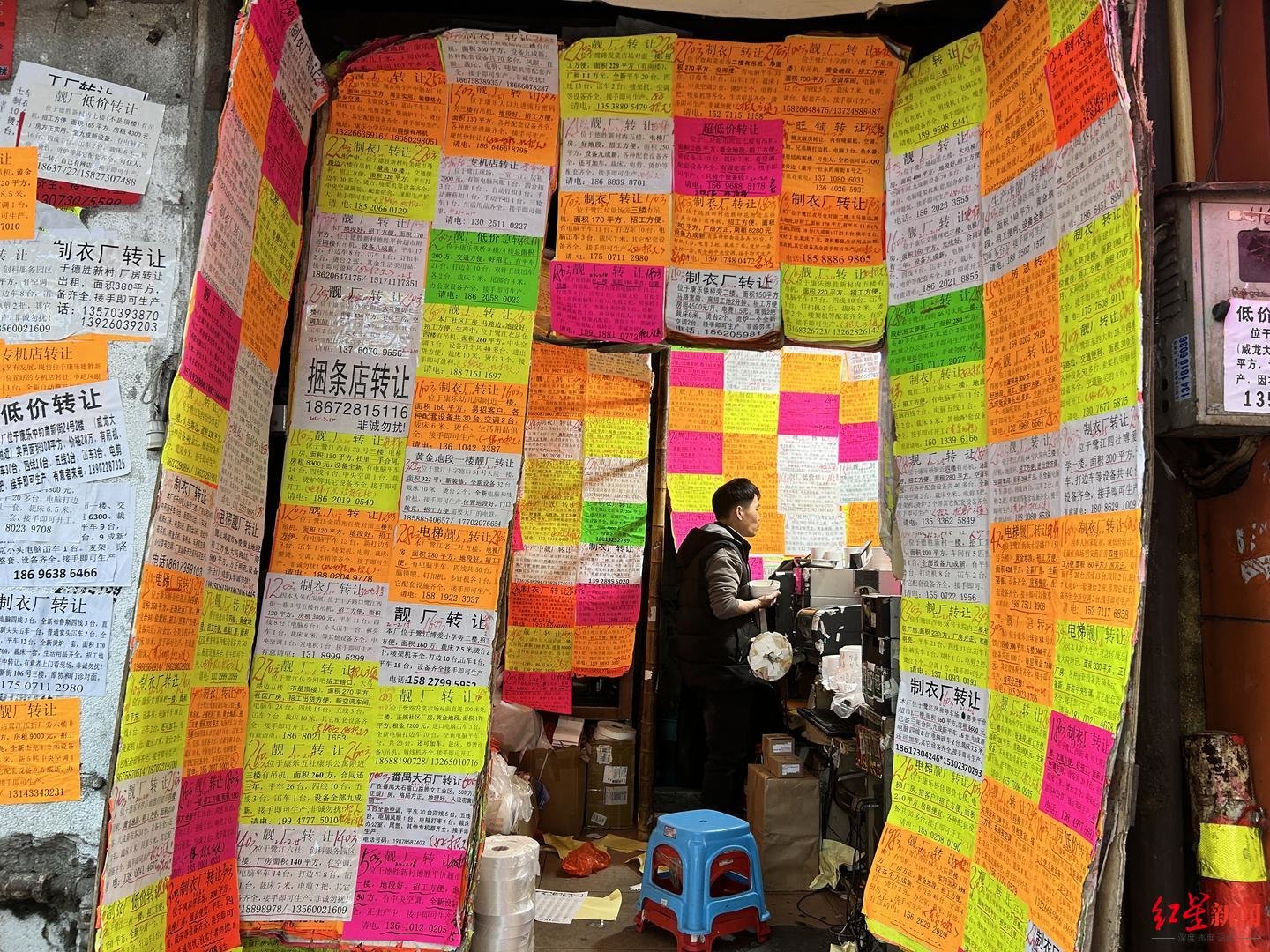 ↑刚过元宵节,康乐村一家不到3平米的打印店墙面已被制衣厂的转让告示贴满