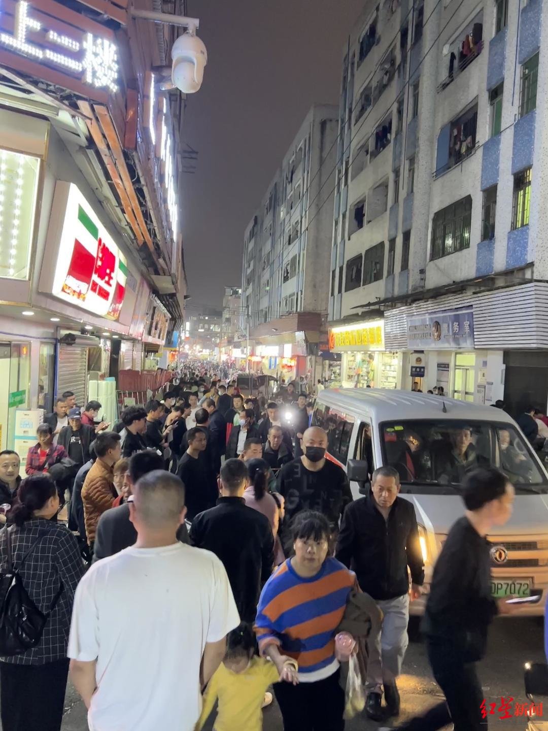 ↑下午6点到凌晨,是制衣村最忙碌的时候。夜晚的招工街依旧水泄不通,有一定消防安全隐患