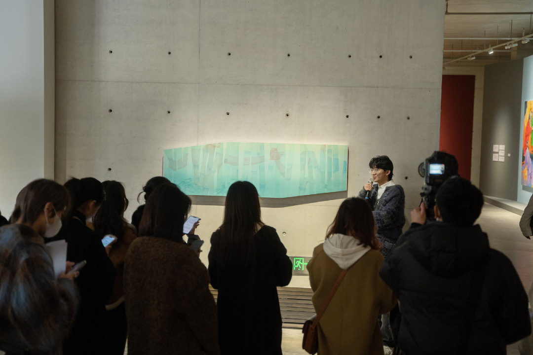 ▲ 参展艺术家徐圣伦在“图像的影子——当代绘画的媒介、体制与空间”展览现场与媒体交流