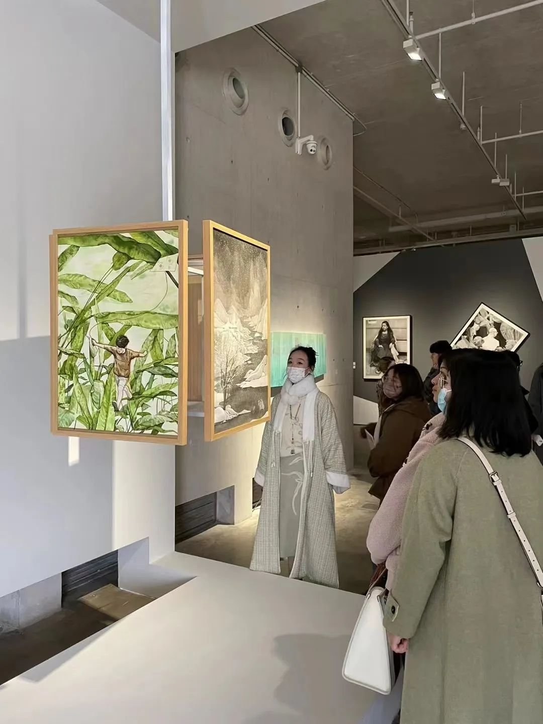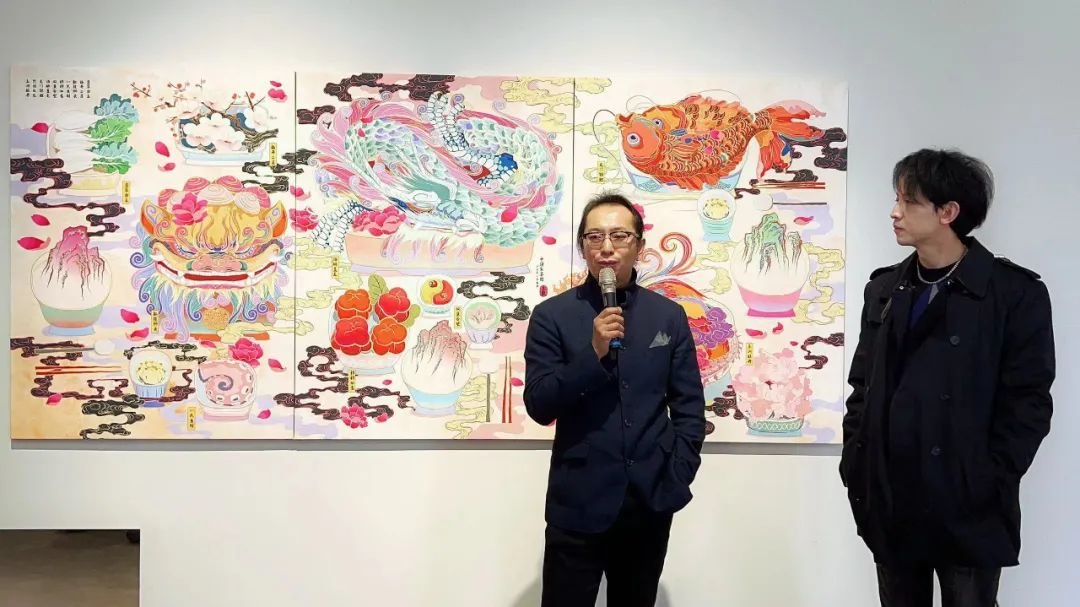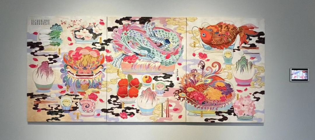 周名德作品《此山中》弥合时空的裂缝,采用多条屏体现中国画的多变性和灵动,观者能体验穿行画中的奇妙,现场舞美也与画作相融合;任刚在古代丝绢上创作《知织》,外轮廓为书架体现文化载体的转变;李欢的《花千树》通过想象力营造花灯、锦鲤簇拥而来的氛围感,用数字艺术媒介和中国工笔画法、波普艺术的构成形式打造一场元宵节花灯会,展现出中国人的极致浪漫。画家们贴近真实生活,在表现形式、主题表达、画面造型上带来直观的视觉和情感冲击,绘就一幅幅有温度、有深度的佳作。