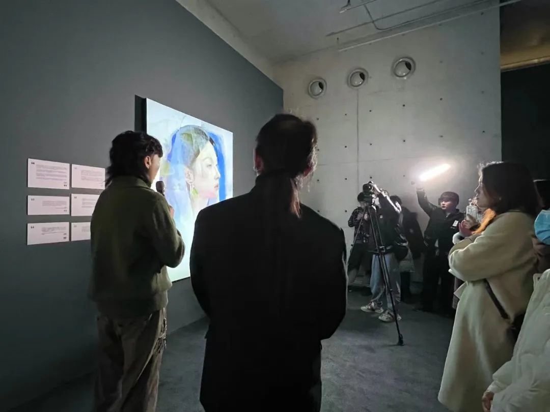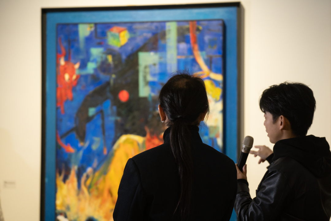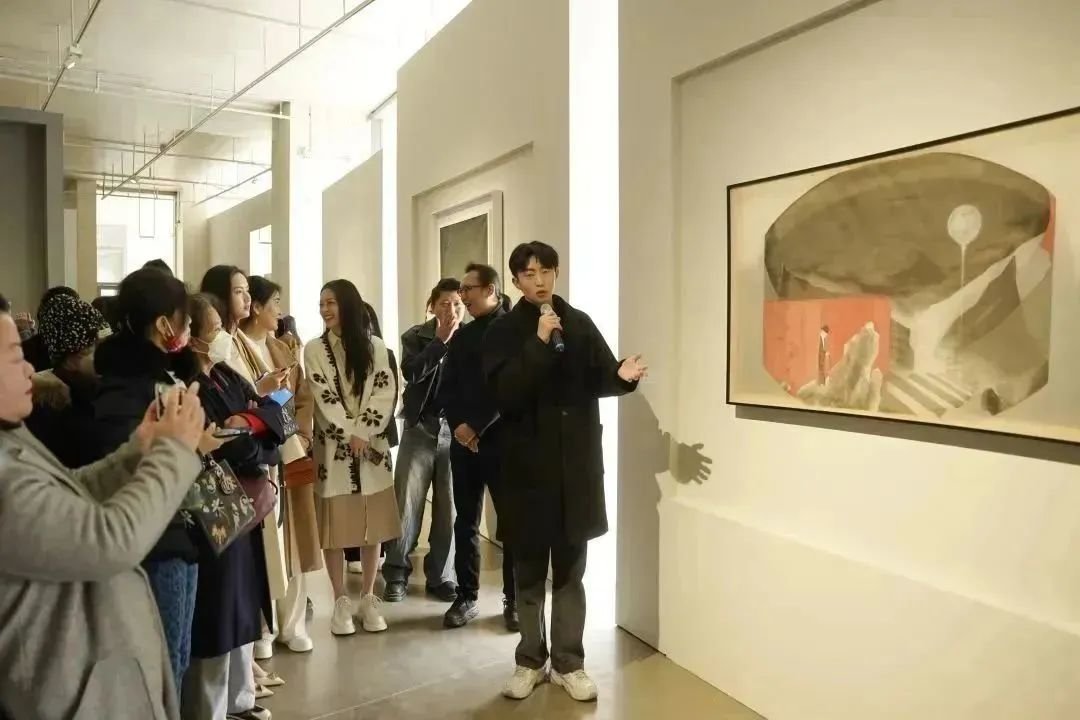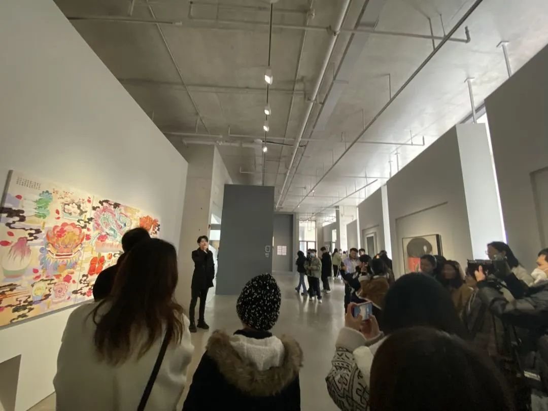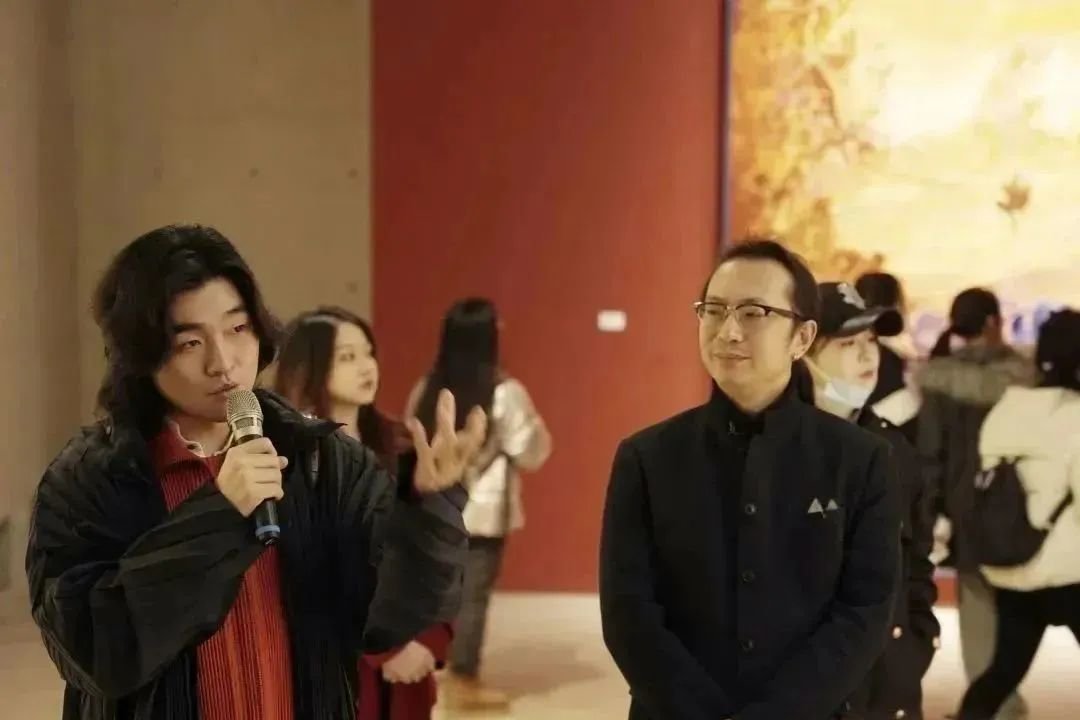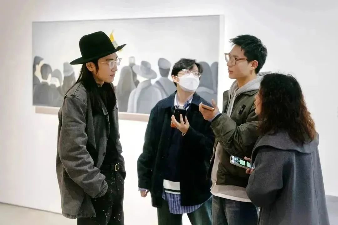▲ 参展艺术家李欢在《会画少年的天空》节目收官展览“图像的影子——当代绘画的媒介、体制与空间”现场介绍作品,与观众交流,2023,长沙谢子龙影像艺术馆