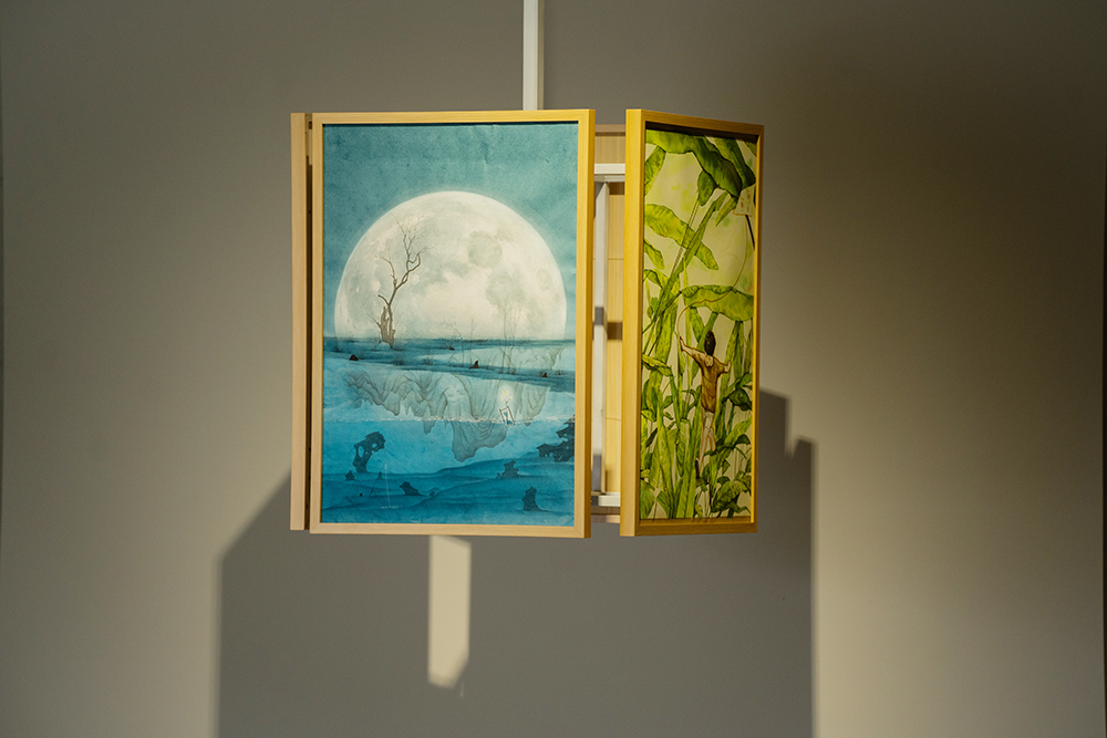 擅长中国画的于立洋呈现的《提月者》《山居·鹿饮》等7件(组)作品,拓宽了对城市、人文与自然之间关系的解读,其具有互动性的拼贴作品《家园》以山水画的意境描绘了现代城市夜景,画面中的点点星光犹如城市在低声诉说对明日的期待。