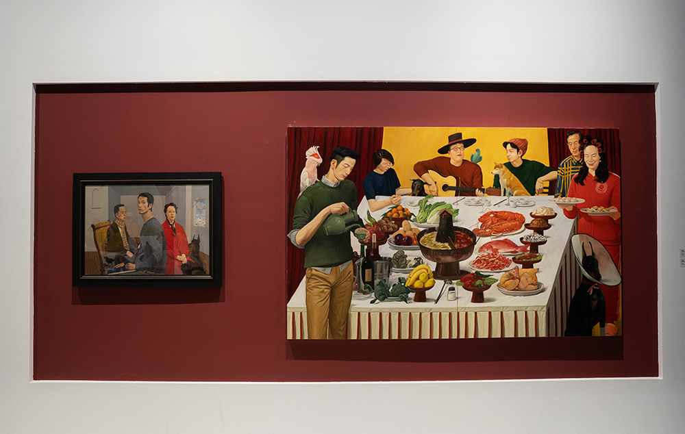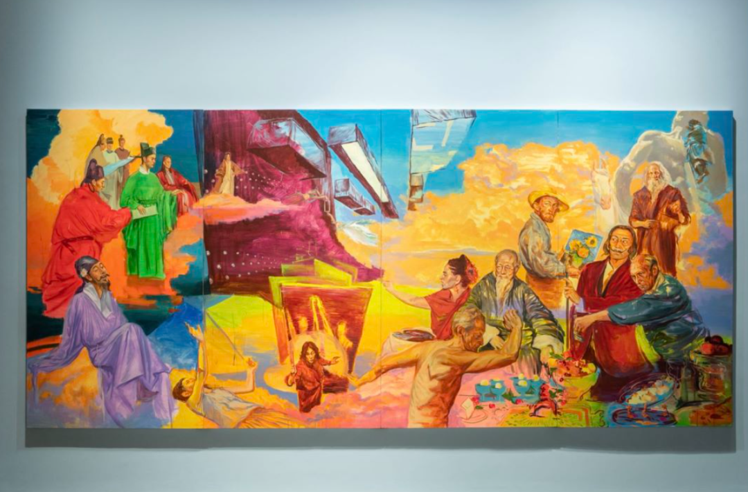 ▲ 李欢,《家宴图》,2023,数字绘画,300 × 133 cm,“图像的影子——当代绘画的媒介、体制与空间”展览现场,2023,长沙谢子龙影像艺术馆