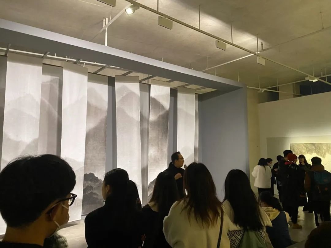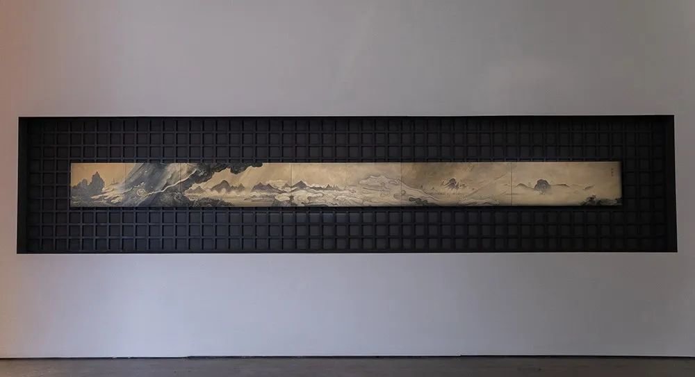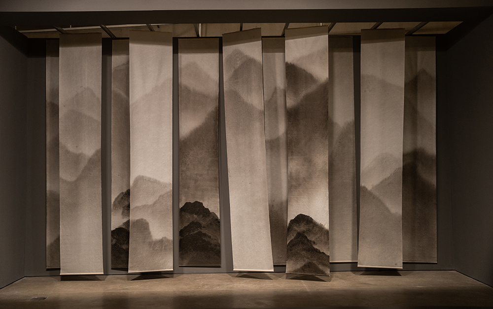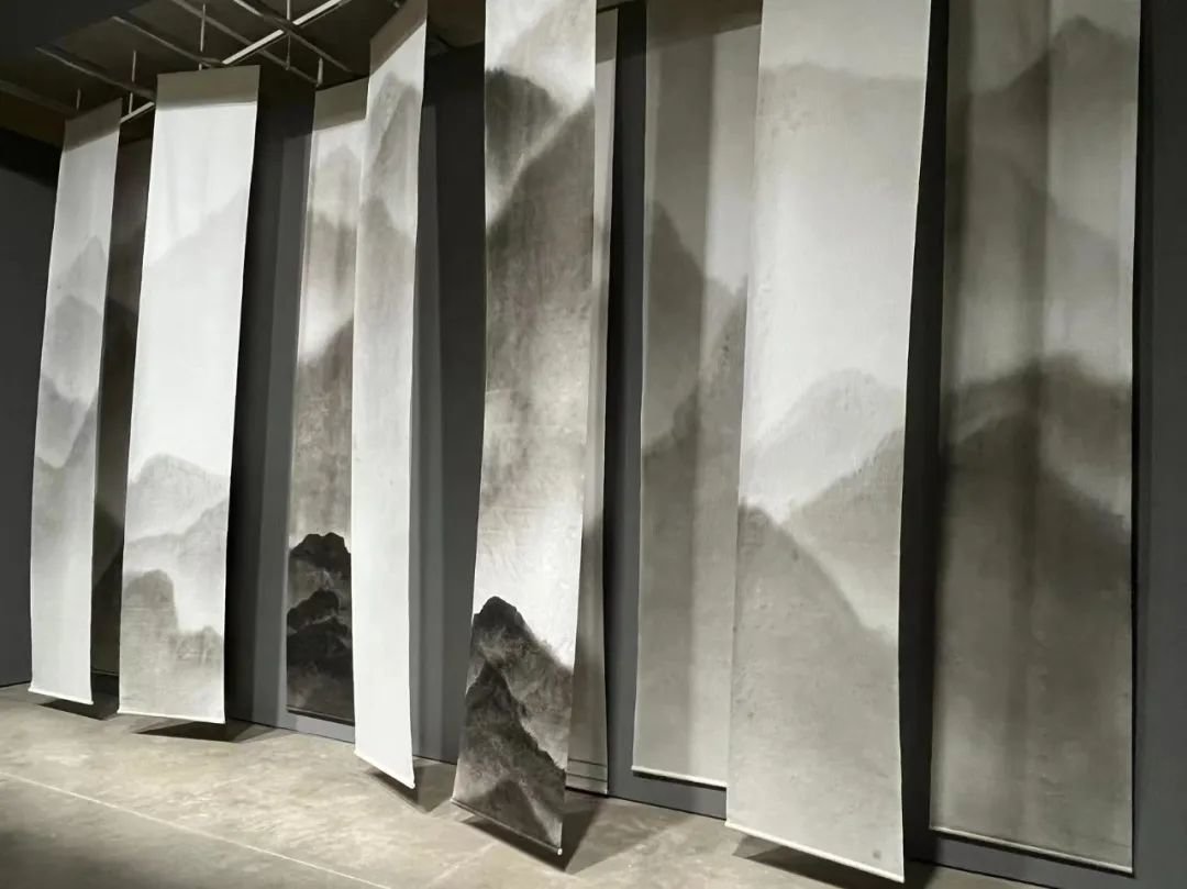 ▲ 周名德,《此山中》,2019,纸本水墨,69 × 383 cm(× 11),“图像的影子——当代绘画的媒介、体制与空间”展览现场,2023,长沙谢子龙影像艺术馆