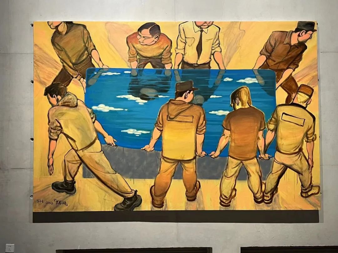 ▲ 徐圣伦,《生活万岁》,2023,木板丙烯、油画棒,92 × 160 cm(× 3)、92 × 200 cm,“图像的影子——当代绘画的媒介、体制与空间”展览现场,2023,长沙谢子龙影像艺术馆