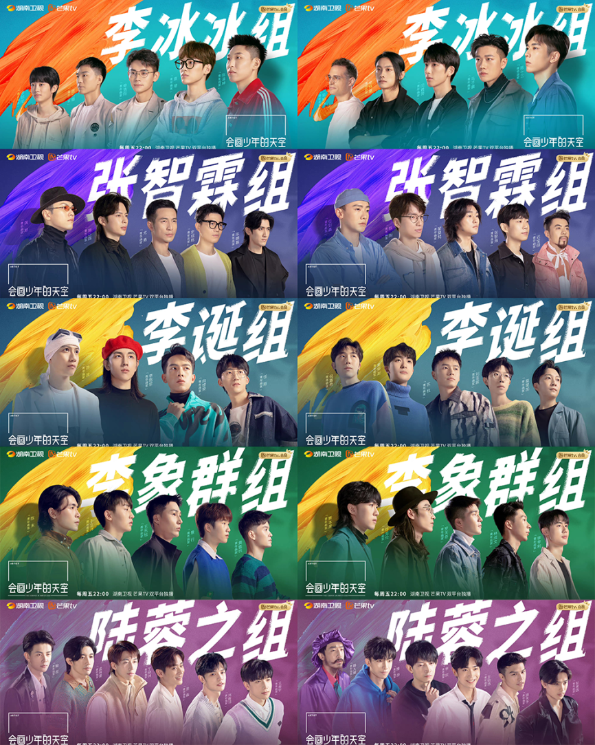 ▲《会画少年的天空》中的五位策展人,从左至右:演员李冰冰、鲁迅美术学院院长李象群、策展人陆蓉之、歌手张智霖、脱口秀演员李诞