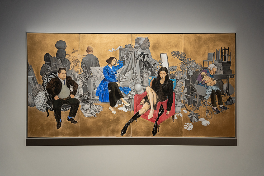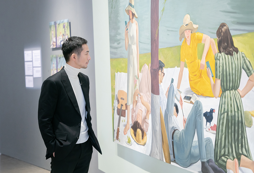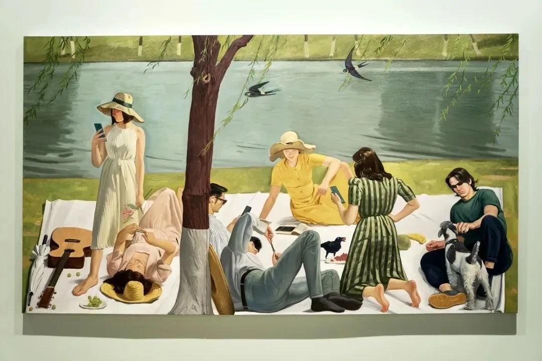 尤勇通过《既济图》《家庭》等9件作品,展现其对新创作语境的持续探索与追求,作品《聚众独处》取材于公园草坪上的野餐聚会场景,画面中人们相聚的同时却沉浸在各自的网络世界中,创作者希望借此呼吁人们回归自然、关注现实。