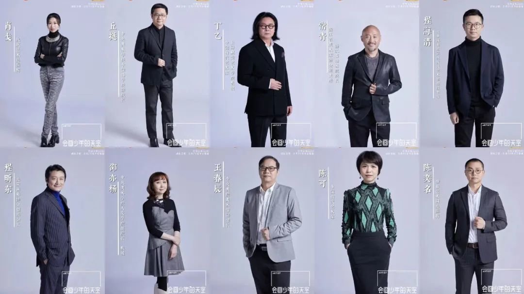 ▲《会画少年的天空》专家评审团:从上至下:凤凰艺术总编辑、策展人肖戈,中央美术学院中国画学院副院长、艺术家丘挺教授,上海视觉艺术学院教授、艺术家丁乙,浙江画院院长、中国美术学院常青教授、保利拍卖专家程海青、北京画廊协会创始会长、收藏家程昕东、中央美术学院人文学院副院长、艺评家邵亦杨教授、中央美术学院美术馆副馆长、策展人、艺评家王春辰教授,艺术家陈可,雅昌艺术网总编辑陈奕名