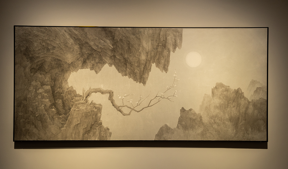 周名德的《冰的无声诗》《寻月》等5件(组)山水画作品突破了传统中国画的创新与可能,其中的巨幅作品《此山中》高度近4米,创作者将完整的画面切割、重组,为观众提供熟悉且富有趣味的游历感。