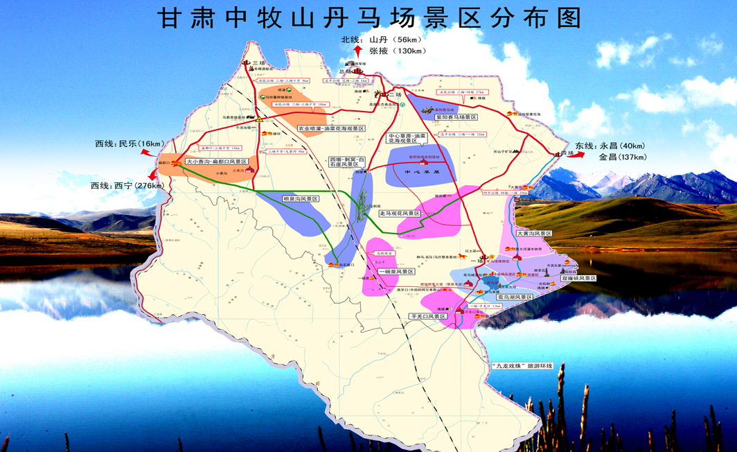 山丹马场不仅以养育良驹宝骥驰名中外,草原风光更是分外迷人。当你走进这片辽阔的大草原,那一阵阵习习凉风、嘶嘶马鸣,一朵朵白云悠悠,满目绿草茵茵,万顷金黄的油菜花铺天盖地,祁连雪峰如刀剑直插云天,顿感心旷神怡,神清气爽。尽可骋目驰怀,谈古论今。你若有兴寻幽览胜,还可深入与大草原相通的“窟窿峡”“大黄沟”“大、小香沟”“平羌口”等祁连山口。那里更是奇峰凸立、怪石嶙峋、山泉喷涌、古木参天,别具一方洞天。