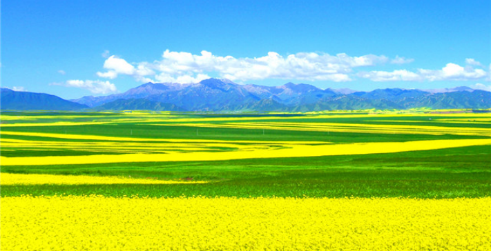 微风阵阵,千里沃野,铺天盖地的油菜花海,连绵起伏,在夏日骄阳的照耀下,铺展成光芒四射、一望无际的黄金地毯。远处山峦起伏,白云悠悠,雍容华贵的金色在皑皑白雪和炎炎烈日的映衬下,流光溢彩;微风吹拂,阵阵清香令人心醉神迷。