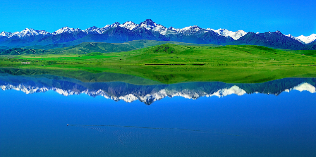 地处祁连山冷龙岭北麓的山丹军马一场南面。蓝天白云,雪山草地,相互映衬,就像镶嵌在冷龙岭臂弯里的一颗蓝宝石一样璀璨夺目。