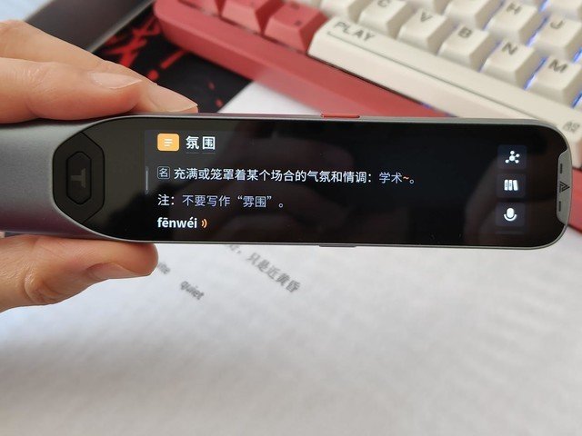 我们以中高考最容易出现的语文汉字发音为例,氛(fēn)围经常会有人读成氛(fèn)围导致很多人在这个题当中丢分,使用阿尔法蛋AI词典笔T20可以快速查询到氛(fēn)围这个词的标准发音,而除了标准发音之外,阿尔法蛋AI词典笔T20还给出了汉语词典中的解释,以及联想到的近义词和英文释义。