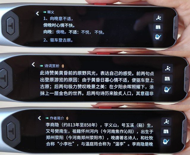 除此之外,使用阿尔法蛋AI词典笔T20扫诗查询,还能获得详细的诗词赏析与作者简介的阅读拓展。配合右侧的AI老师讲古诗文,更能够让孩子融会贯通地学习,加深理解。