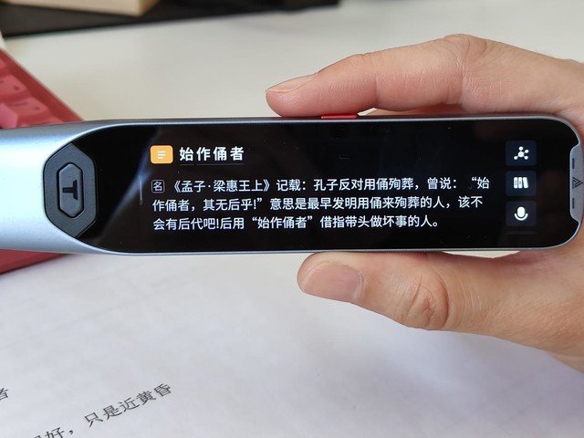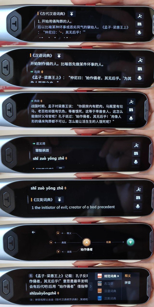 使用阿尔法蛋AI词典笔T20可以非常迅速地查到“始作俑者”这个成语的来历,以及古代汉语/现代汉语词典对这个成语的解读,甚至出处、典故都解释得一清二楚,同样,阿尔法蛋AI词典笔T20也能给出相应的近义词解读。