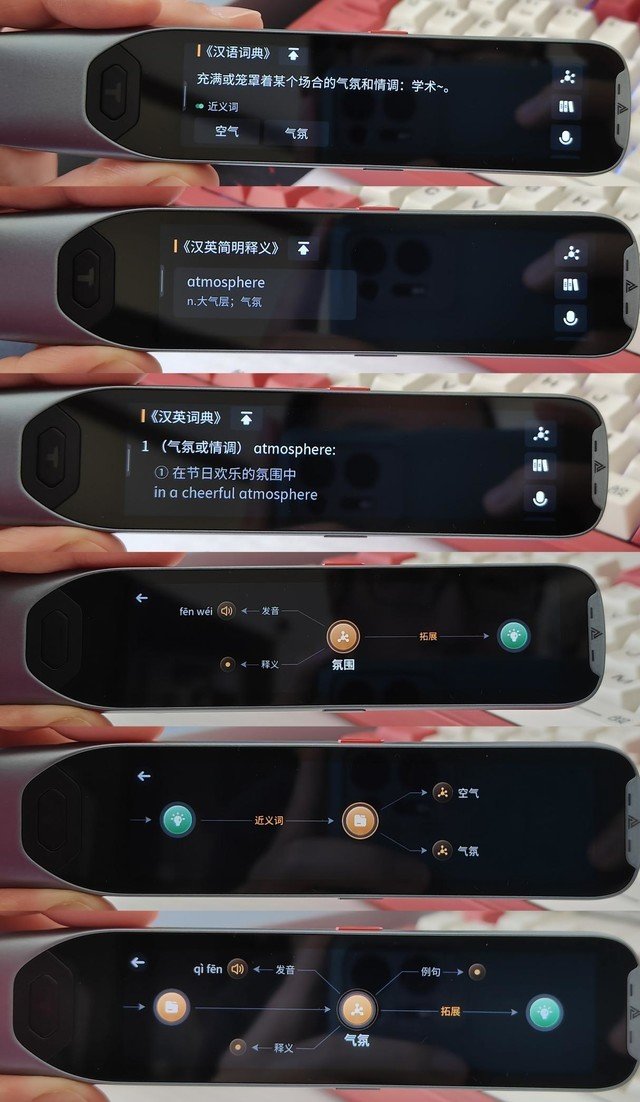 右侧边栏除了知识图谱外,中英词典查询,包含规范词典、汉语词典、英汉简明、英汉词典等。如“氛围”在阿尔法蛋AI词典笔T20英文翻译过来就是atmosphere,释义:查询更加快速精准。值得一提的是,全新升级的阿尔法蛋AI词典笔T20支持中文口语评测功能,孩子可以跟读词典笔的发音,进行汉字口语评测,系统会从调型、声母、韵母三个方向给孩子的发音进行打分,让孩子在不断练习当中,提升汉字的标准化发音,牢牢记住汉字读法。
