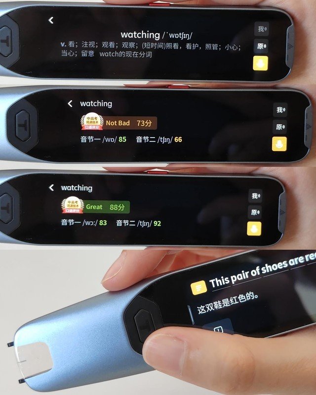 比如英文单词Watching,那么在朗读的时候,系统会把这个单词拆分为两个音节,单独打分,这样就能清楚地看到究竟是哪个音节发音不准。除了单词评测之外,阿尔法蛋AI词典笔T20还支持英文短句的评测,在朗读之后,还可以通过机身自带的T键查看语法详解,更加全面了解英文句式的含义。