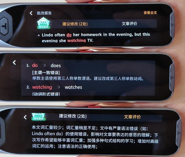 通过阿尔法蛋AI词典笔T20的作文批改功能,扫描所写英文段落,可以非常快速地找到这段英文句式当中出现的语法问题,并对错误问题进行详细解读。