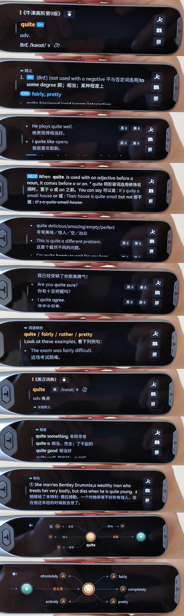 使用阿尔法蛋AI词典笔T20可以很好地解决这个困扰,尤其是快速查单词方面,轻轻扫一扫单词释义即可出现,同时使用阿尔法蛋AI词典笔T20也会针对于这个单词进行三遍诵读,加深孩子对于这个陌生单词的记忆,释义下方配有通过quite这个单词造的句子,同时注明了这个单词来自《牛津高阶第九版》课本,以及通过quite这个单词延伸出来的多个英文词语。