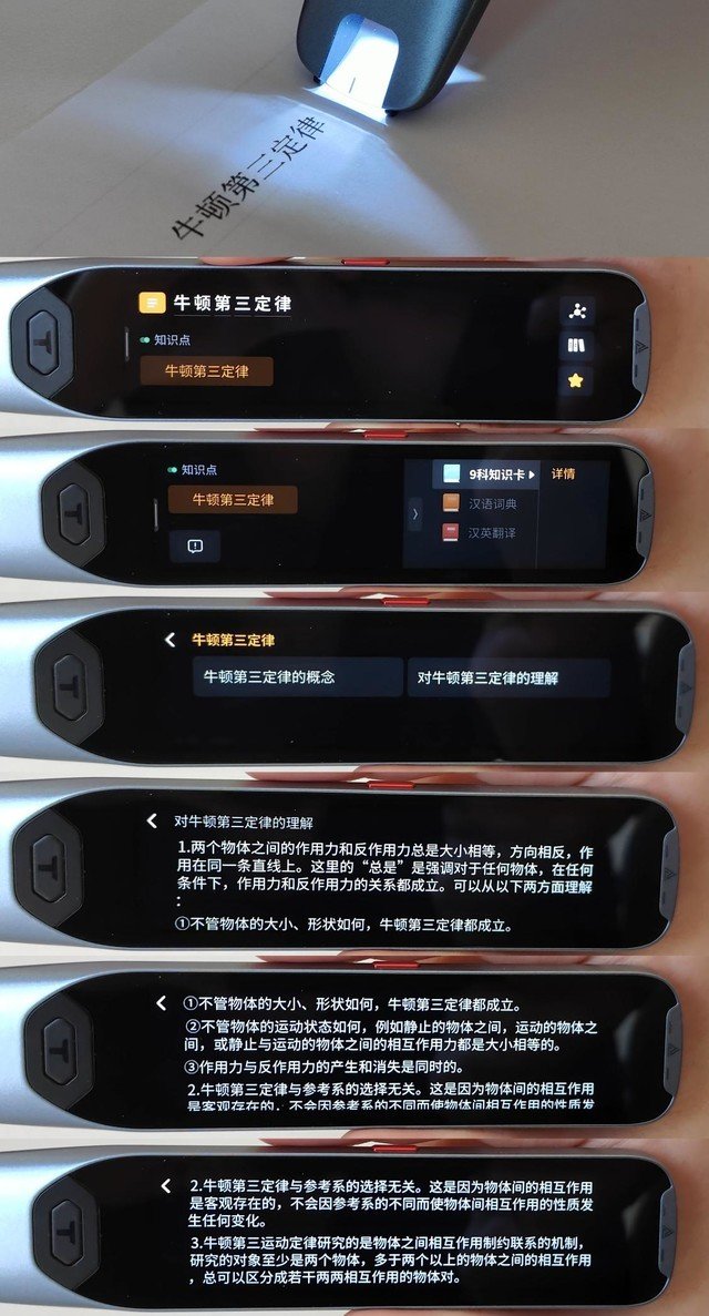 比如孩子要查询牛顿第三定律,只需要扫一扫这个词,便可获得这个词的知识点结构,包括牛顿第三定律的概念诠释,以及牛顿第三定律的理解,查询起来相当方便。值得一提的是阿尔法蛋AI词典笔T20融合了苏教版、北师大版、北京版、鲁科版、人教版等多达8个版本的出版社,能够全方位同步课内教材,多学科知识点,一笔搞定。
