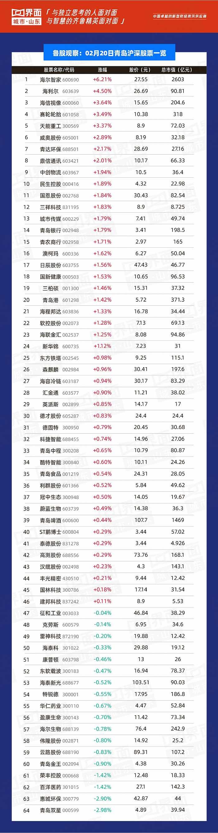 青岛市涨幅榜首:海尔智家(600690),涨幅6.21%,股价27.55元,总市值2603亿元;