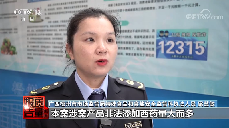 广西梧州市市场监管局特殊食品和食盐安全监管科执法人员 梁慧敏:本案涉案产品非法添加西药量大而多。其中有西地那非、他达拉非是治疗男性勃起功能障碍药物,二甲双胍为治疗高血糖,醋酸泼尼松、双氯芬酸钠及氧氟沙星均为激素、消炎、抗生素等药物。假冒的保健食品非法添加西药量从几百毫克到几万毫克不等。质量和剂量都不能得到控制,过量使用西地那非等药物会对老年人的健康和生命造成严重威胁。