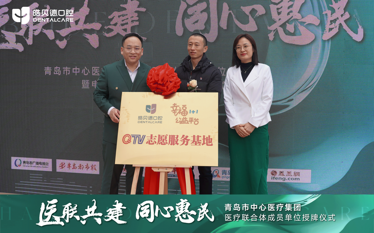 本次仪式上,青岛电视台《幸福1+1》公益平台负责人张爱华就皓贝德口腔-青岛电视台志愿服务基地成立一事致贺辞,并与城阳街道办事处副主任仇胜龙、皓贝德口腔医疗集团创始人崔航共同进行了揭牌仪式。
