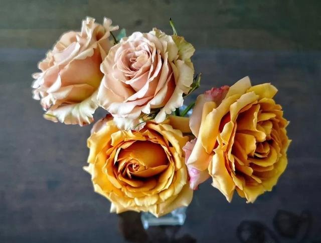 在那么多颜色、花型的月季中,我特别喜欢被称为“复古色”那一种类型的月季。这类月季现在品种也非常多,我养过的有这么几种:“拿铁咖啡”,它外层的花瓣是咖啡色,中心的花瓣则是棕黄色,而且它的花心是双螺旋状的,很特别;“青金石面纱”,它边缘的花瓣是带些灰的绿,中心的花瓣则是灰粉紫色,慢慢变淡变白;还有“松之梦”,它的花在边缘带一些粉,当中是黄色,但黄得有一些假,像年代久远的金器,又像蒙上了薄薄一层铜锈的黄铜。这些花的颜色,在初开、盛开和开老时都有微妙的变化,难以准确描述。
