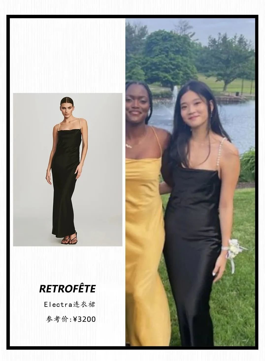 毕业派对上身着的纽约小众品牌RETROFÊTE黑色长裙售价495美元≈3200元人民币。