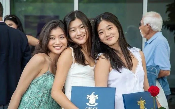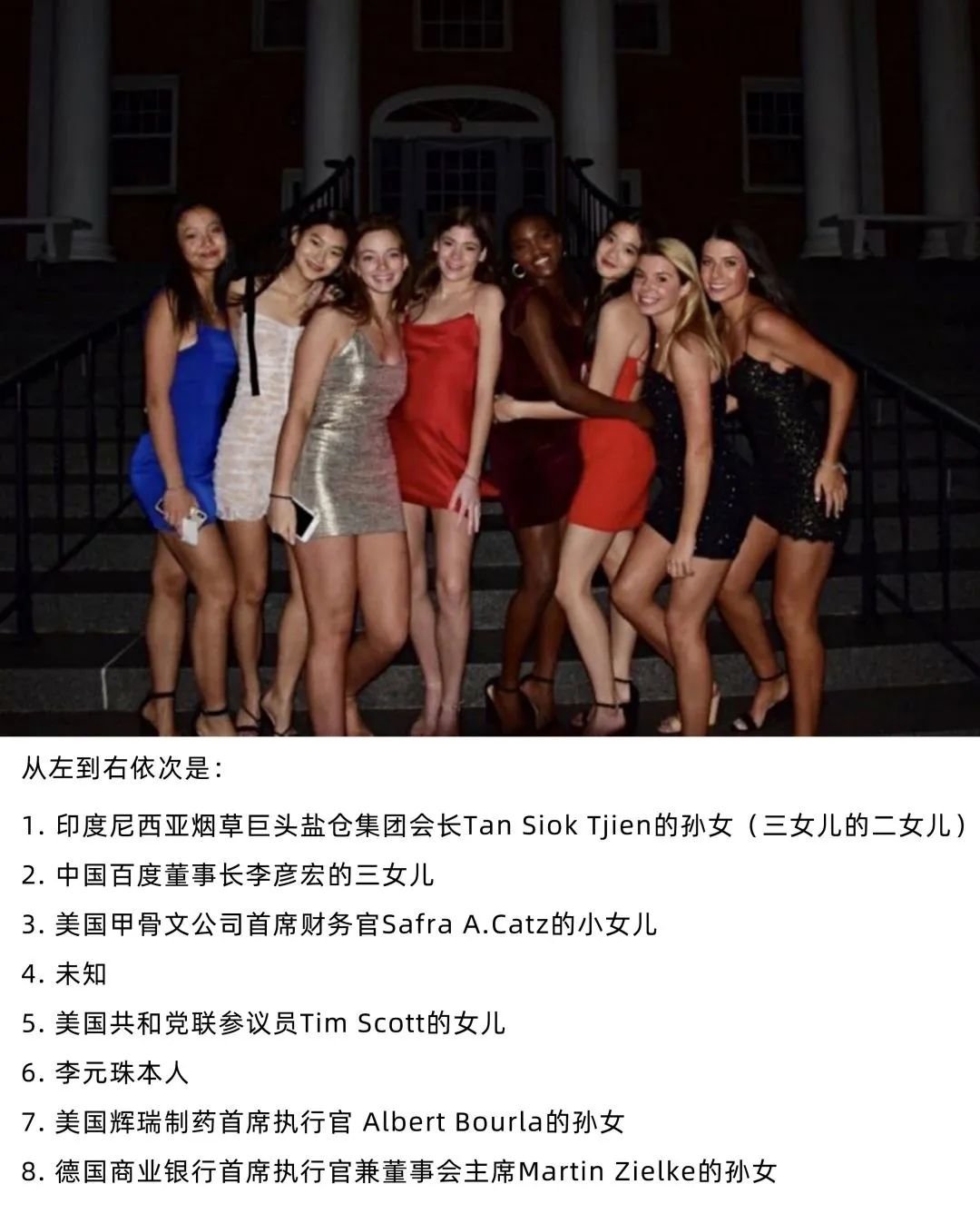 出国之后就读于名校——乔特罗斯玛丽学校,是前总统约翰逊肯尼迪的母校,一年学费40W+人民币,和伊万卡是校友。这张传言中的“千亿闺蜜团”的名图就来源于这个时期。