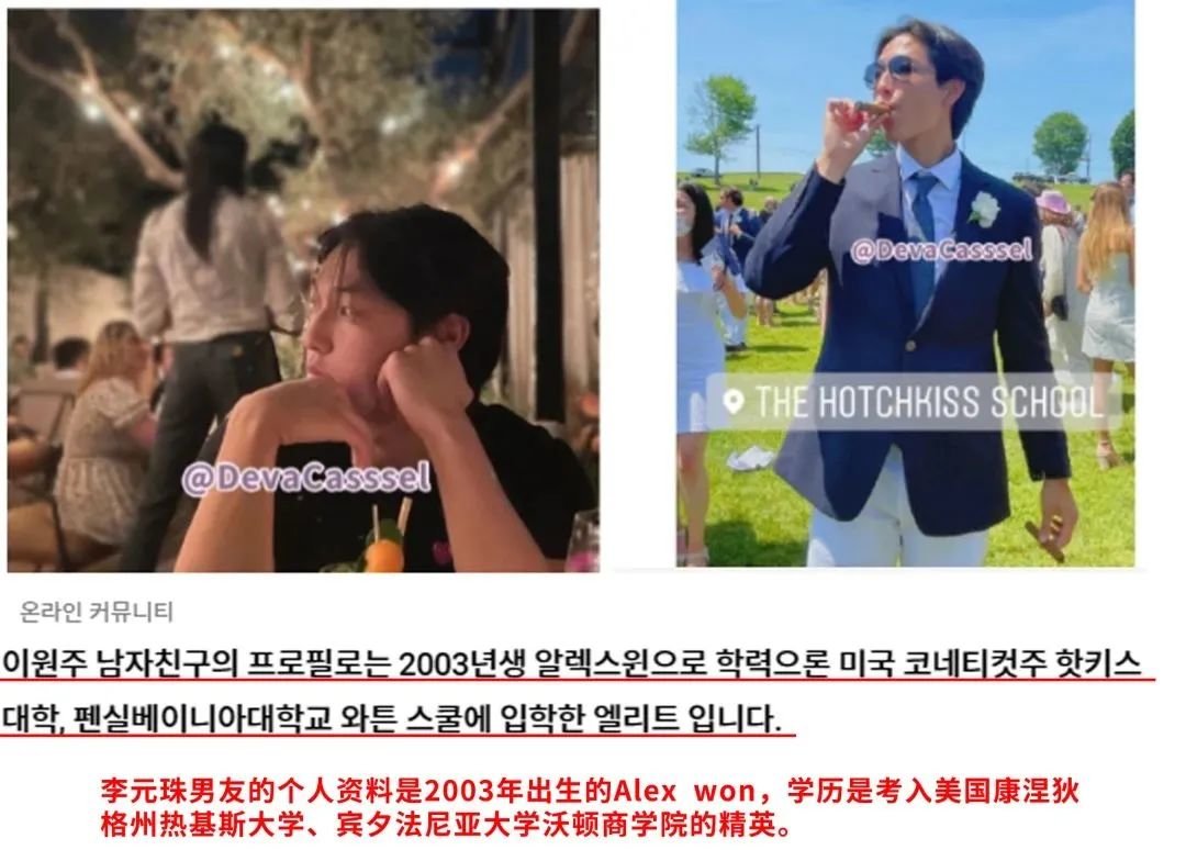 最近还被传恋情曝光,男方名叫Alex won,2003年出生的韩国人,是就读于沃顿商学院的精英学霸。