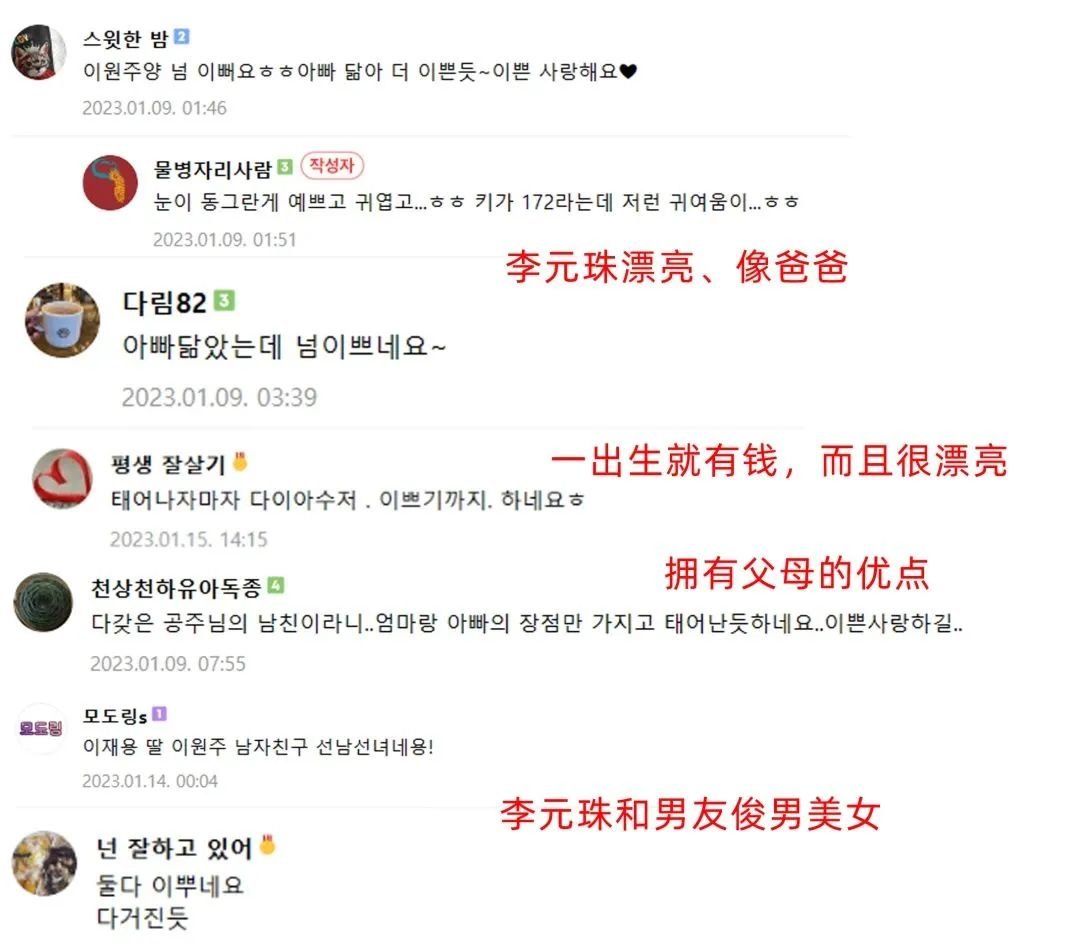 韩国网友的态度大多都是说两人很配,夸赞李元珠“不仅有钱而且漂亮、长相酷似爸爸……”