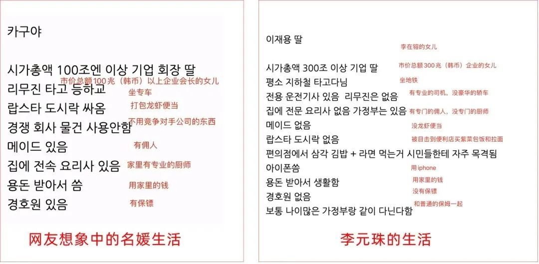 如同这张韩国人心中的名媛生活和李元珠的生活对比图一样,这更像是普通人对所谓富人们的过度想象。任何圈层都有不同的人和不同的选择,难以用某个标签去集体定论。