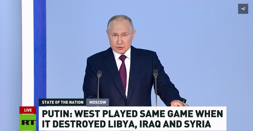普京在国情咨文中指出,俄乌冲突由西方挑起,俄罗斯正在阻止,并采取了一切可能的和平手段解决危机。尽管西方正利用乌克兰对抗俄罗斯,但也不得不意识到——“在战场上击败俄罗斯是不可能的”。他同时认为,西方的经济制裁未能奏效,俄罗斯经济并未受到影响。