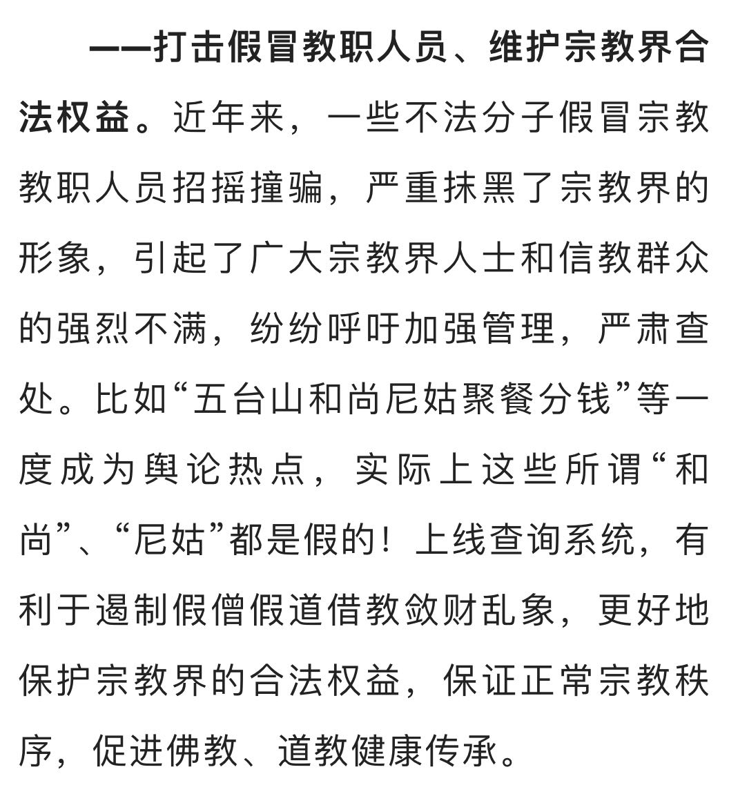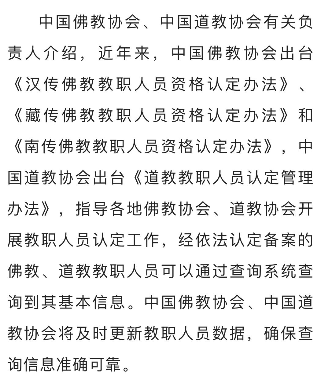 据了解,佛教、道教教职人员信息查询系统通过互联网向社会公众提供经依法认定备案的佛教、道教教职人员信息查询服务,在中国佛教协会网站、中国道教协会网站、国家宗教事务局网站和中国西藏网同步上线。新语君梳理了三个社会上最关心的问题,为大家逐一解答。