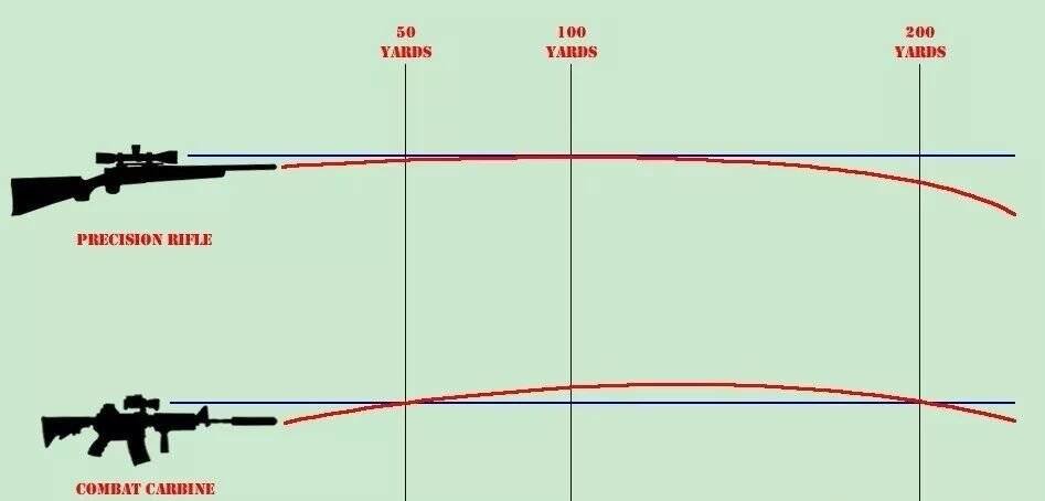 由于瞄准镜一般都安装在枪管上方,因为这里位置最合适,也符合人体工学,瞄准起来姿势不别扭,比较省力。但这样一来就让瞄准线高过了弹道顶点,所以实际使用中瞄准镜和枪管是有一个夹角的,如果以瞄准镜看出去的瞄准线为水面线,枪管轴线延长线是指向水平线上方的。这样弹头飞出去后,会先向前向上飞行,然后向前向下飞行,飞行弹道会与瞄准线有两次交汇,第一次在弹头上升阶段,第二次在弹头下降阶段,第二次交汇点就是瞄准点,如果一切正常,子弹会在第二个交汇处击中目标。