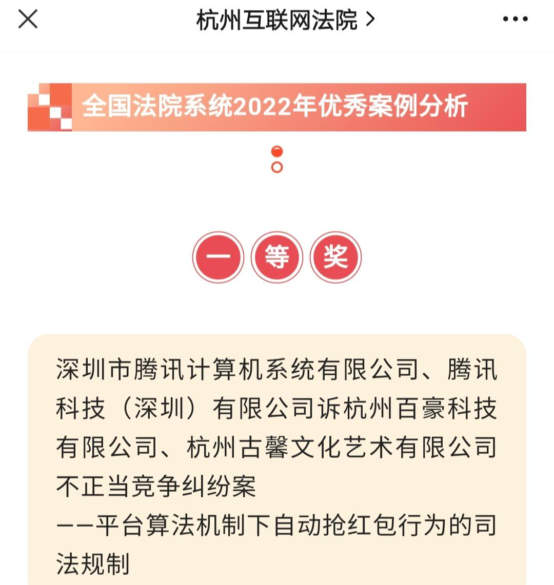 近日,杭州互联网法院公布了入选2022年的国家级典型案例,其中平台算法机制下自动抢红包案获全国法院系统2022年优秀案例分析一等奖。红星新闻记者从该案原告代理律师处获悉,案件刚于去年终审结案,维持一审判决,认定杭州百豪科技有限公司(下称“百豪公司”)、杭州古馨文化艺术有限公司涉案行为构成不正当竞争,赔偿深圳市腾讯计算机系统有限公司(下称“腾讯计算机公司”)、腾讯科技(深圳)有限公司(下称“腾讯科技公司”)经济损失合计70万元。
