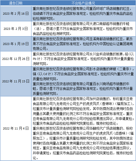 2022年8月以来重庆商社新世纪百货连锁经营有限公司旗下分支机构所售产品食品安全抽检不合格情况