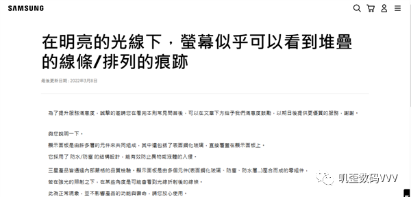 从产品的角度或者技术的层面来解释,三星S23 Ultra屏幕之所以会出现这个现象,主要是因为手机的显示面板是采用了多层的元器件组成的,比如说有表面的钢化玻璃,防尘防水层等等,最终要通过压合而成,一不小心就会出现这样的现象。而在三星的官网甚至还专门推出了一个页面来解释屏幕上的堆积线痕迹不是产品缺陷。