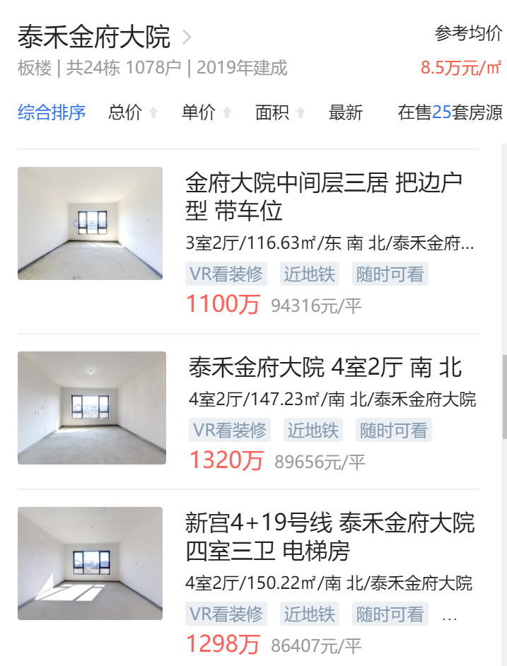 泰禾金府大院同等区间户型挂牌价在8.6-9.4万/平。