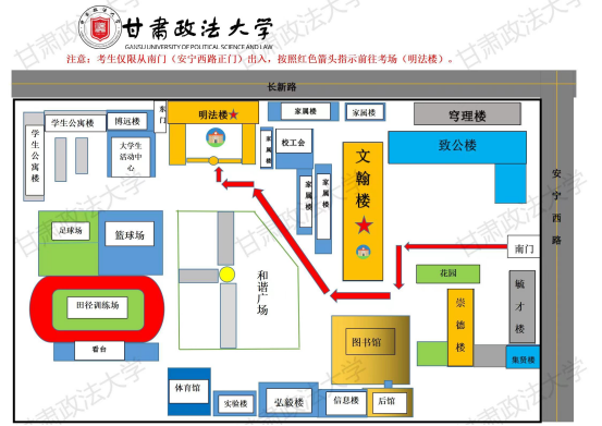考生从学校正门进入。兰州站和客运中心可乘k102路,137路,到土门墩站下车后步行前往。兰州西站可乘地铁陈官营方向1站路到土门墩站下车后步行前往。市内可乘公交k102、137、50、77路、地铁1号线,到土门墩站下车下车后步行前往。