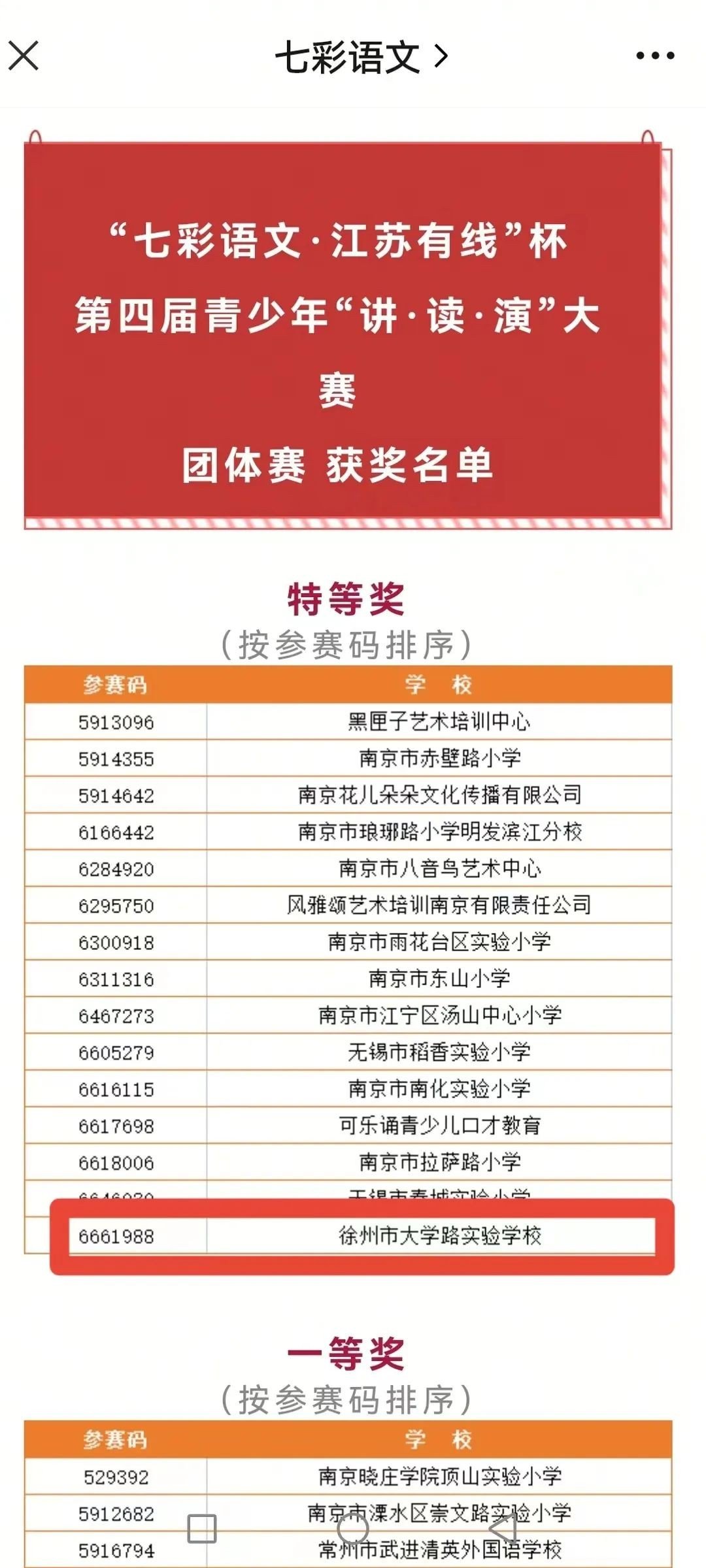 近日,徐州市大学路实验学校再传佳绩——杨丹老师带领的三(6)班诵读团队,在“七彩语文·江苏有线”杯第四届青少年“讲·读·演”大赛中,荣获“团体赛特等奖”!