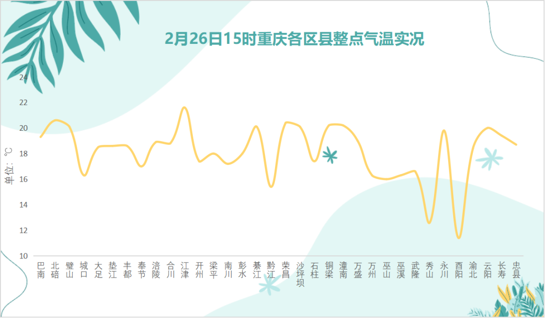 实况监测显示,26日白天各地晴到多云。15时,大部地区气温超过了15℃,其中江津、北碚、荣昌、铜梁、潼南、璧山、綦江、沙坪坝、云阳还站上了20℃平台,最暖和的江津达到了21.6℃!沙坪坝气温为20.1℃!