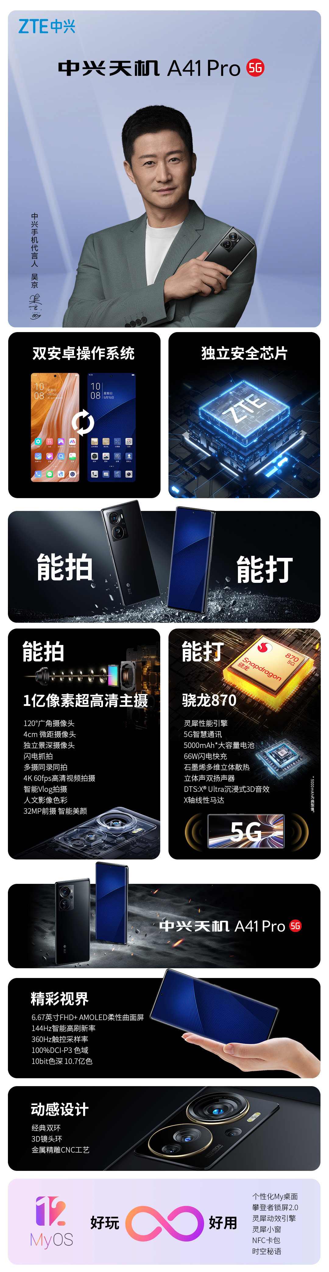该机搭载高通骁龙 870 芯片,采用 6.67 英寸打孔屏,分辨率为 2400×1080,支持 144Hz 刷新率和 360Hz 触控采样率,内置 5000mAh 电池,支持 66W 快充,厚约 8.46mm,重 199g,相比 A41 更轻薄。