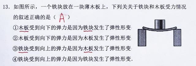 类似的,铁块发生了向上的弹性形变,由于要向下恢复形变,所以会对与之接触的木板产生向下的弹力!一次,木板受到向下的弹力!