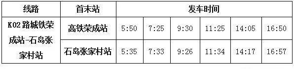 齐鲁网·闪电新闻2月27日讯 记者从荣成公交集团获悉,自2023年2月27日起,荣成增设K02路高铁荣成站—石岛张家村站公交快线,全程票价5元,线路途经站点及发车时间如下,详情请咨询公交服务热线7571234。