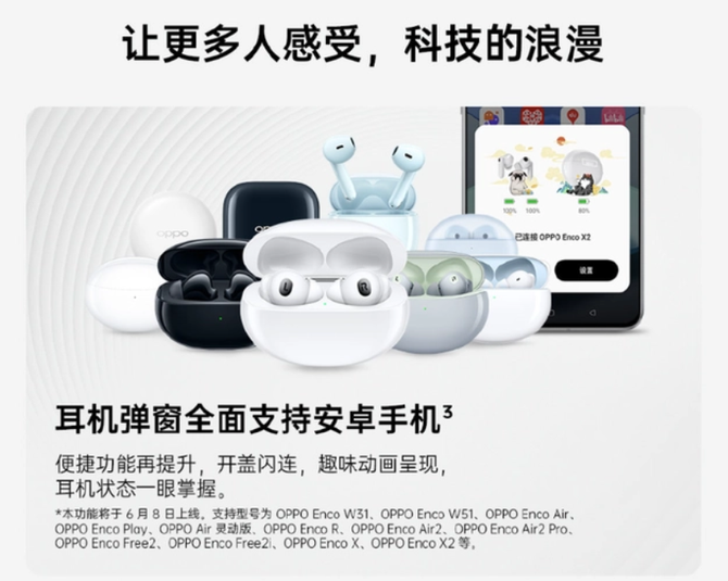 其实早在前些日子,OPPO耳机就已经全面支持安卓手机弹窗了,这也就意味着,即便不是OPPO手机,其它手机与OPPO耳机相连也可获得弹窗动画的效果。笔者实测华为、小米、vivo、三星等品牌皆支持。